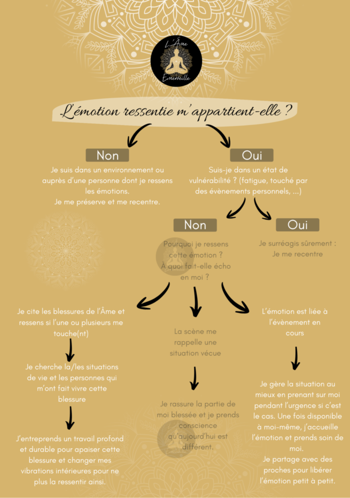 - Afin de mieux les traverser, la première étape la plus efficace est d’effectuer une analyse du ressenti et ce à quoi l’émotion fait écho :